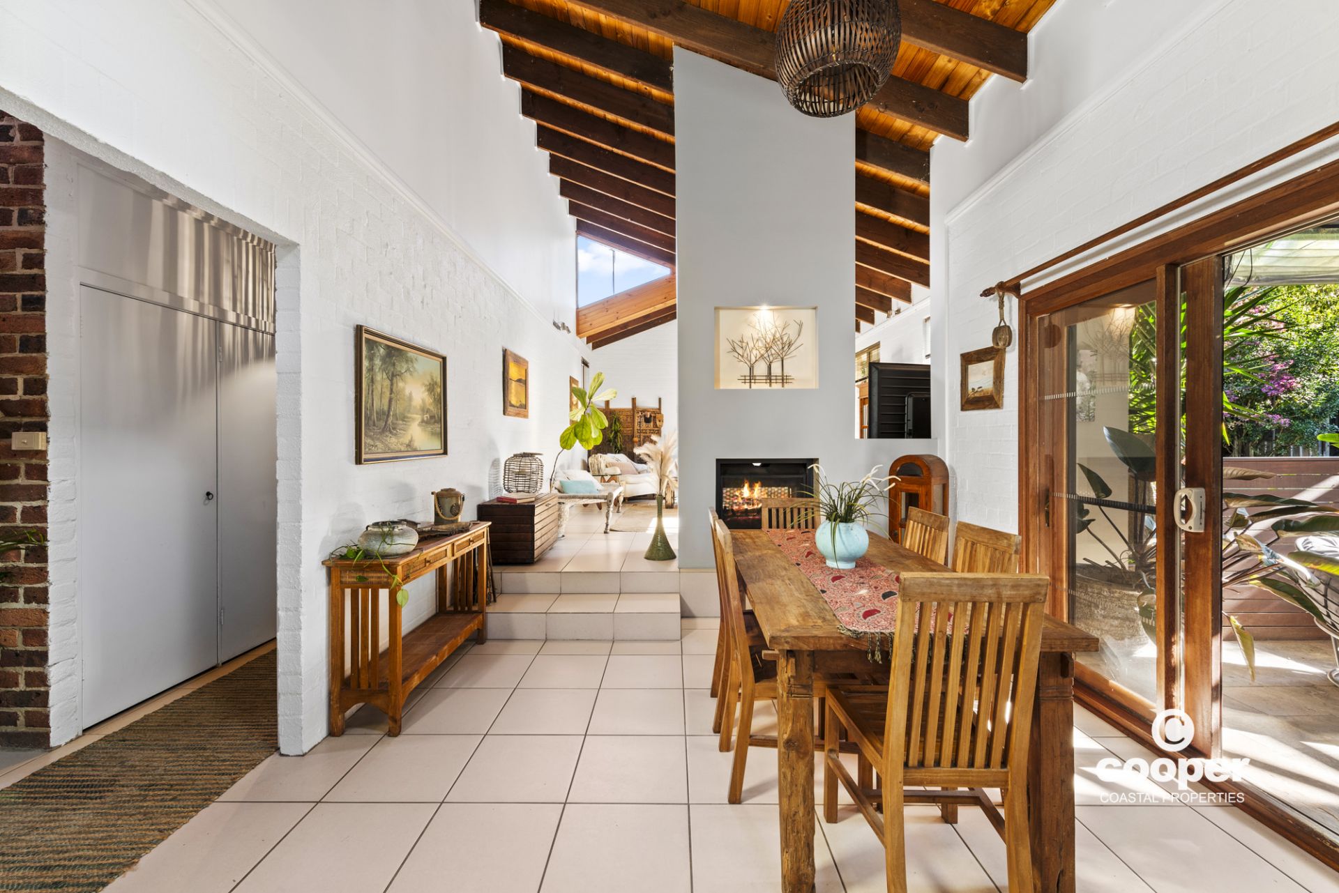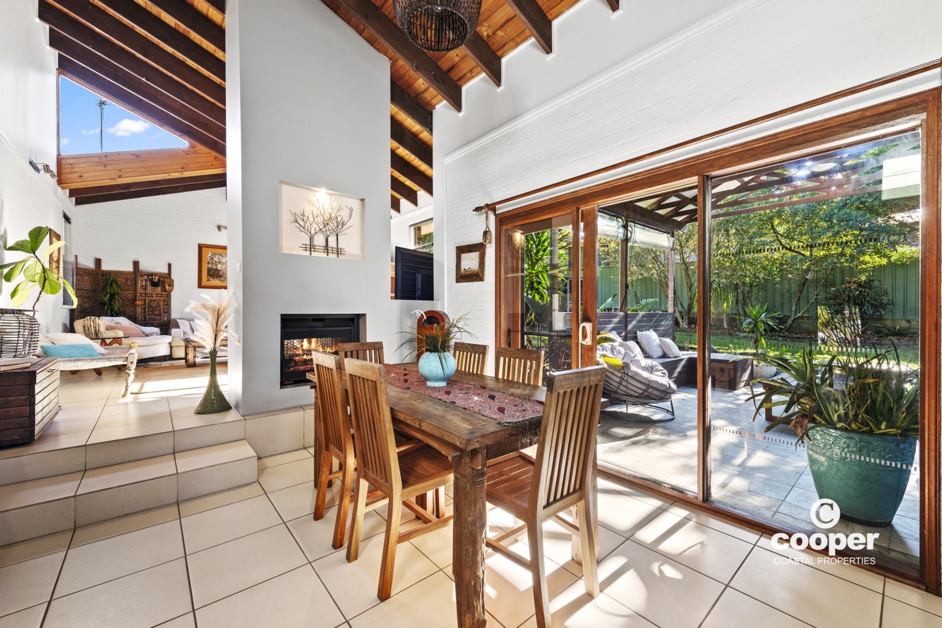 Ideally located in a quiet street, just 1 km to Narrawallee Beach, this coastal retreat features vaulted timber ceilings, well positioned skylights and a central two way fireplace between the lounge and dining rooms.