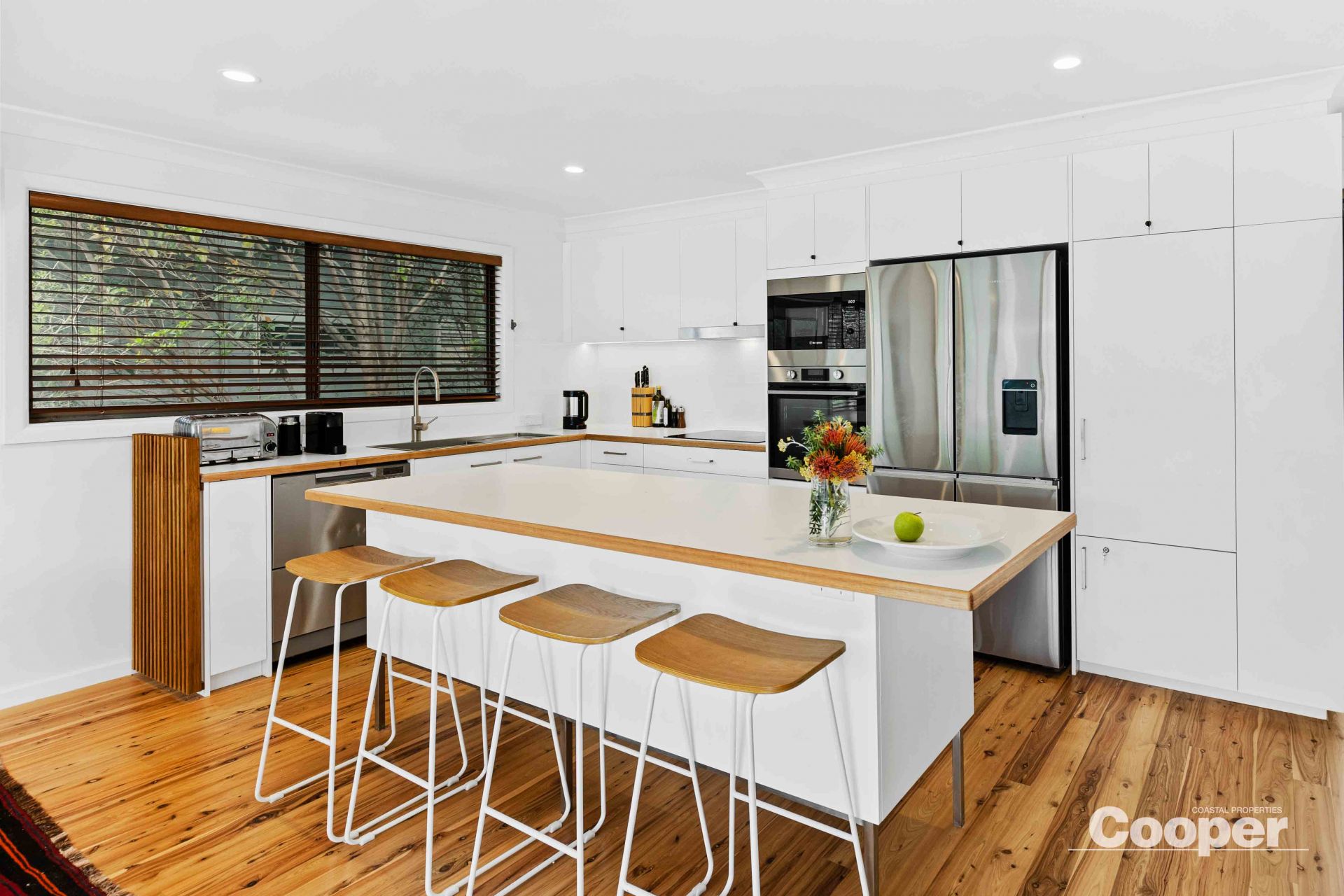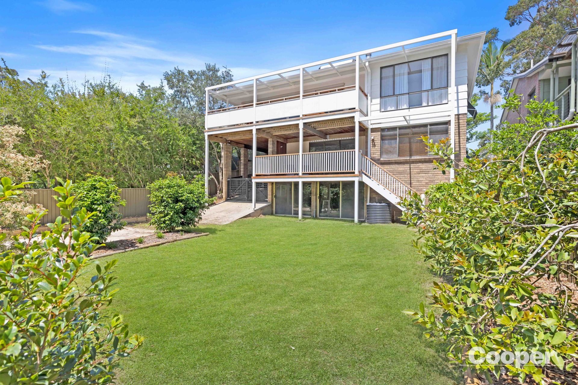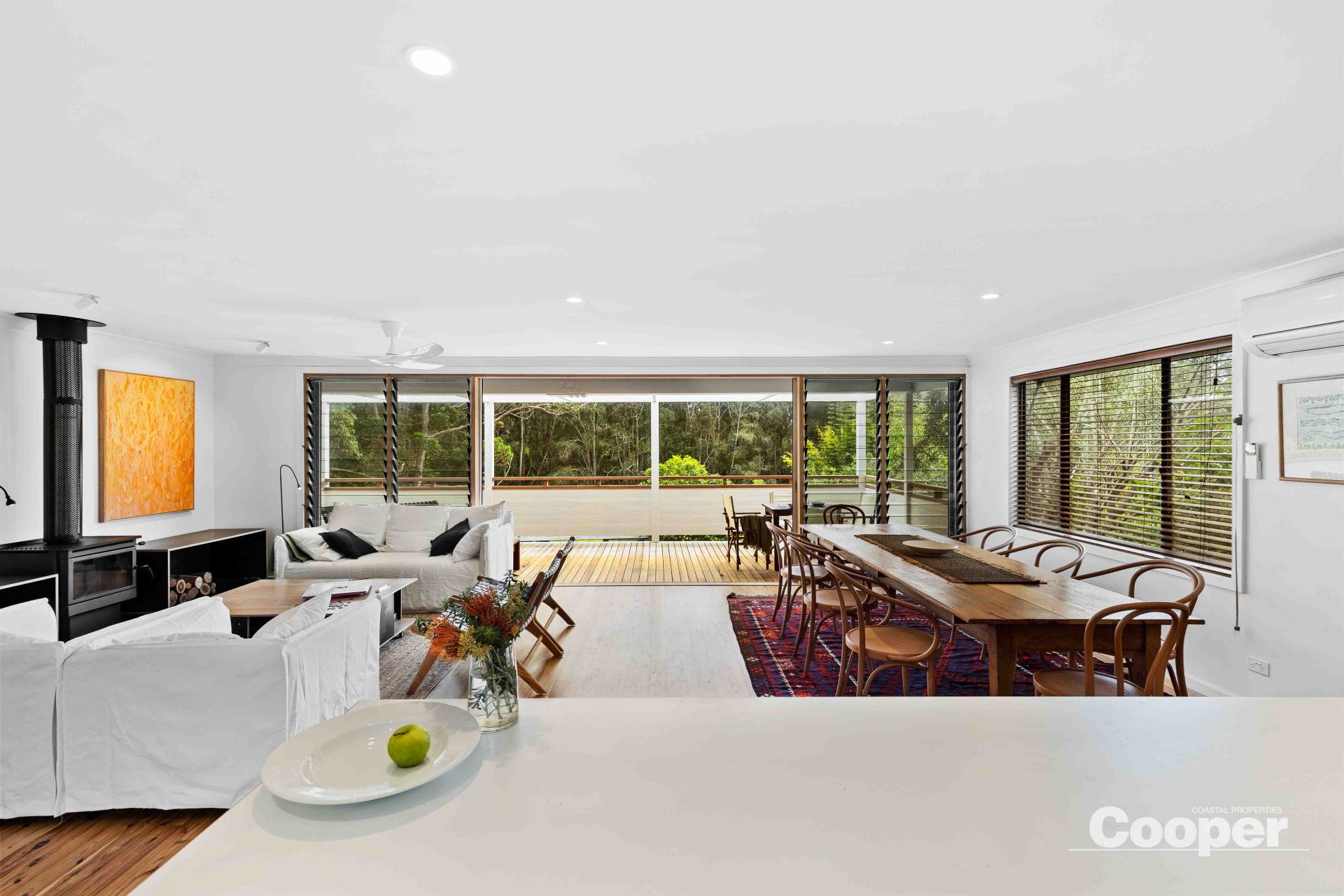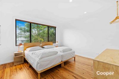 Sunny is a 2 storey house to the street and 3 storeys to the north. The top level has the brand new kitchen, dining and living areas as one generous space flowing out onto the large northerly deck overlooking the lagoon and its natural environs. This huge timber terrace enjoys full north sun from dawn to sunset, an abundance of birds, and is the natural space for breakfast through to evening drinks.
