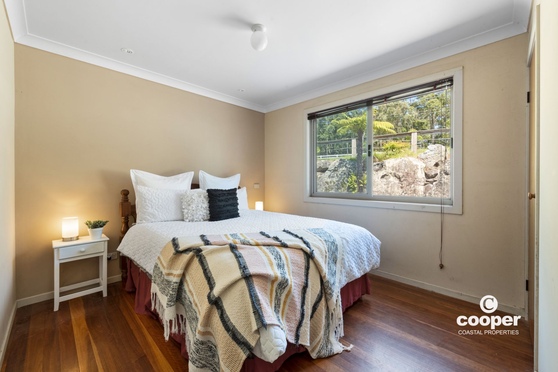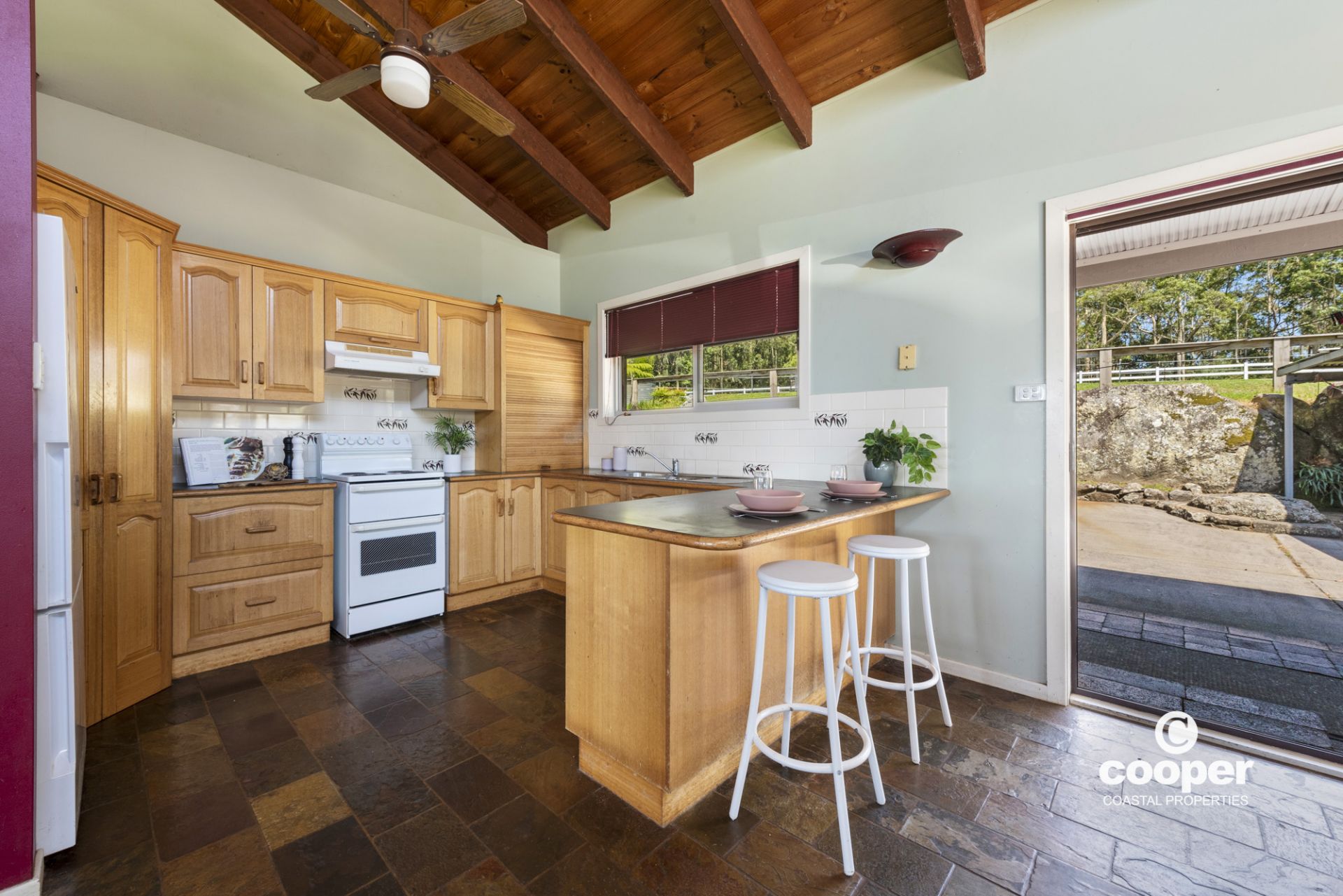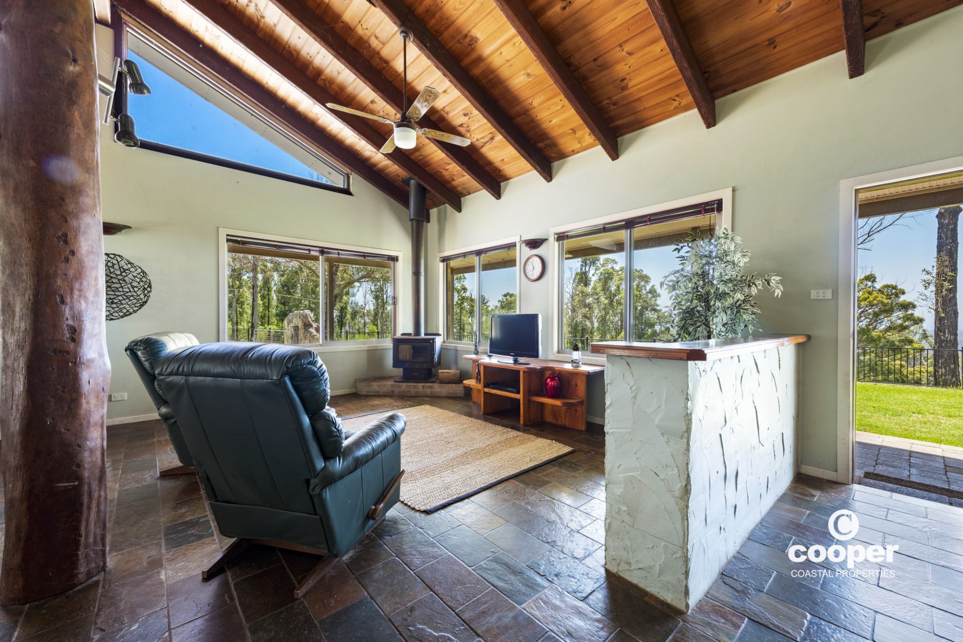 The single level country style home features wrap around verandahs and raked timber ceilings, north facing highlight windows to capture the light, and a cosy wood fire to keep you warm in winter.. Enjoy the beautiful views from most windows, looking out over rolling green pastures, friendly equine faces and the stunning ocean views. Practical hard wearing slate floors at front and rear entries, kitchen, dining and living rooms and beautiful spotted gum timber floors in the hallway and bedrooms. The outdoor entertaining area features local boulders nestled into the land to provide a private al fresco space and unique retaining wall.