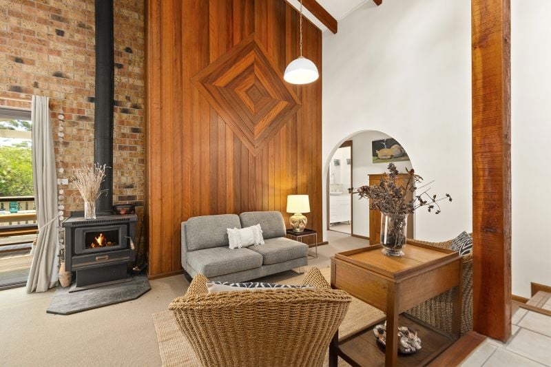 The central motif of the home is a marquetry panelled wall adding a striking visual dimension to the raked ceilings and sunken lounge and dining areas.